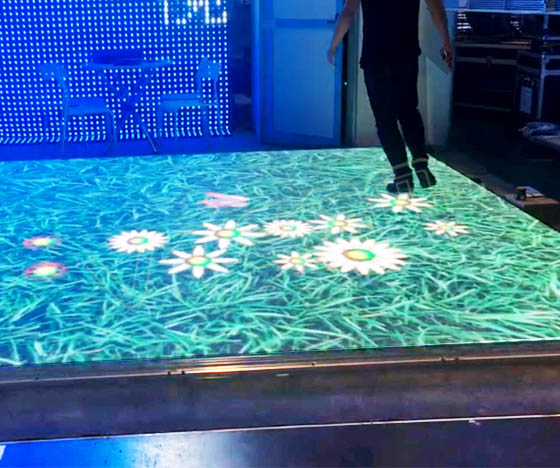 而现在的LED地砖屏不仅在基础性能上有所进步,还能添加了新的功能--感应互动。互动LED地砖屏里面装载有压力传感器或电容式传感器或红外传感器等设备,当人在地砖屏上移动时,传感器能感应到人的位置并将触发信息反馈给主控制器,然后主控制器逻辑判断后输出相应的显示效果。